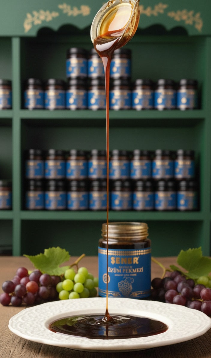 Yoğun aromalı üzüm pekmezi: kahvaltıda tahinle, ara öğünde yoğurtla; çok yönlü, klasik lezzet.
